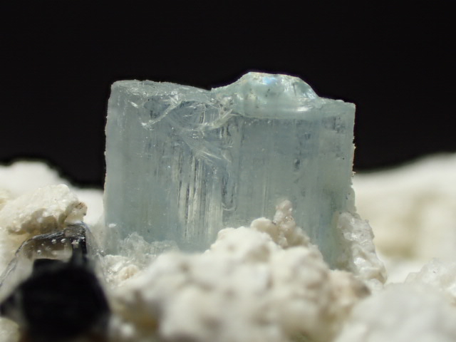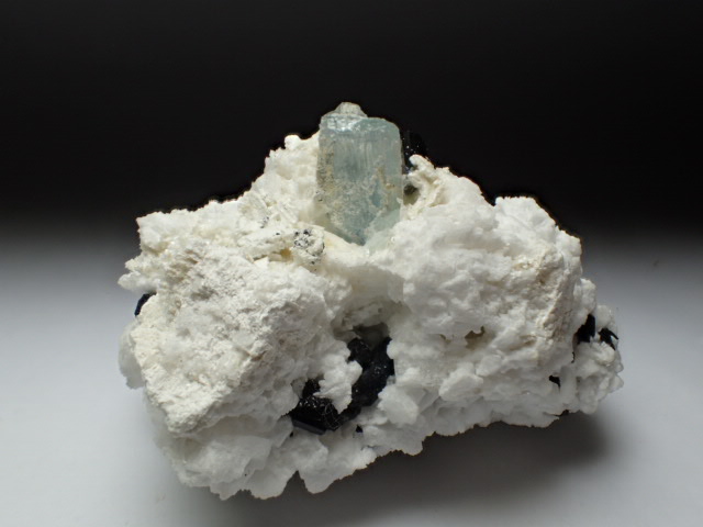 真っ白な曹長石についた淡いブルーの可愛らしいアクアマリンです。ブラックトルマリン(ショールトルマリン)を伴っています。