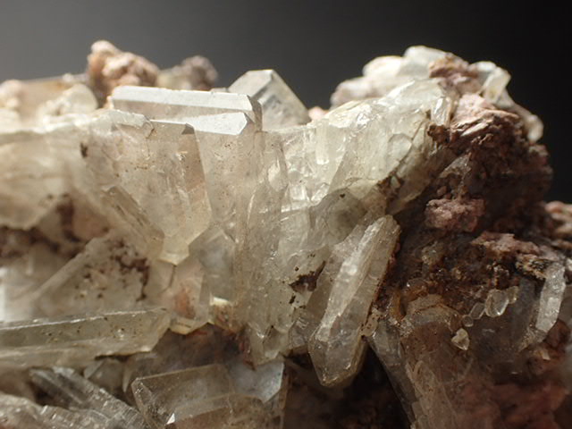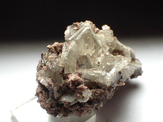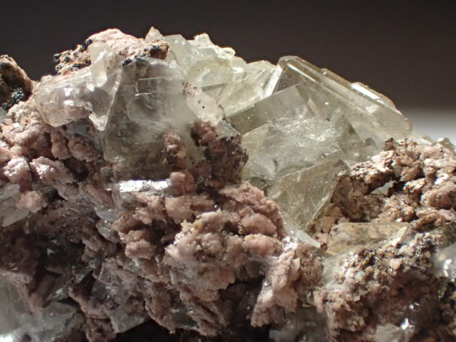 ピンク色の苦灰石についたガラスのような美しい結晶の重晶石です。