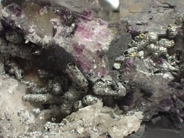 黄〜紫色のフローライトに円筒状の方砒ニッケル鉱がついています。