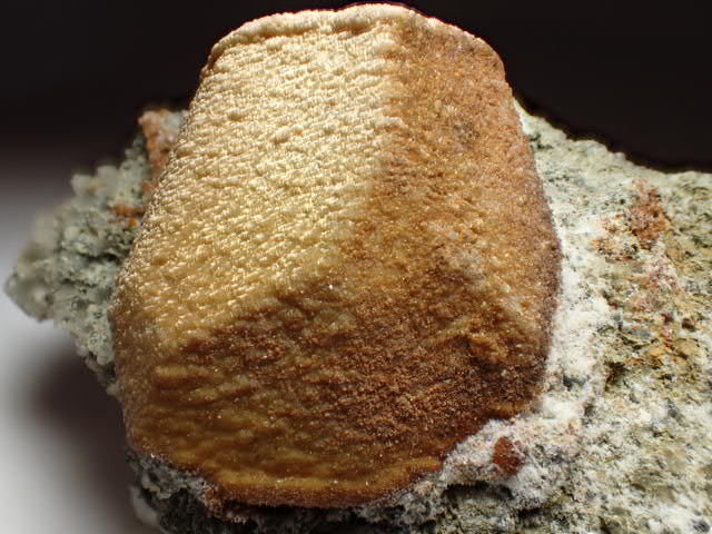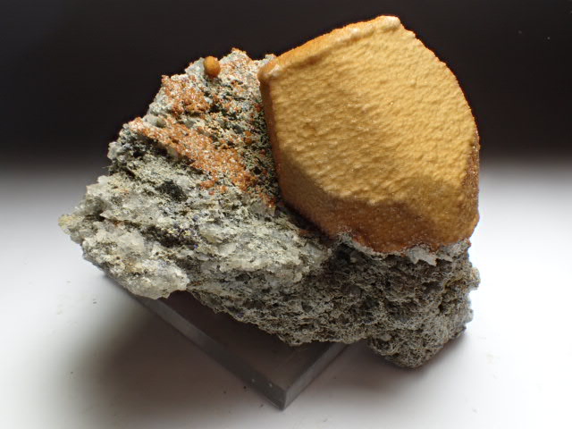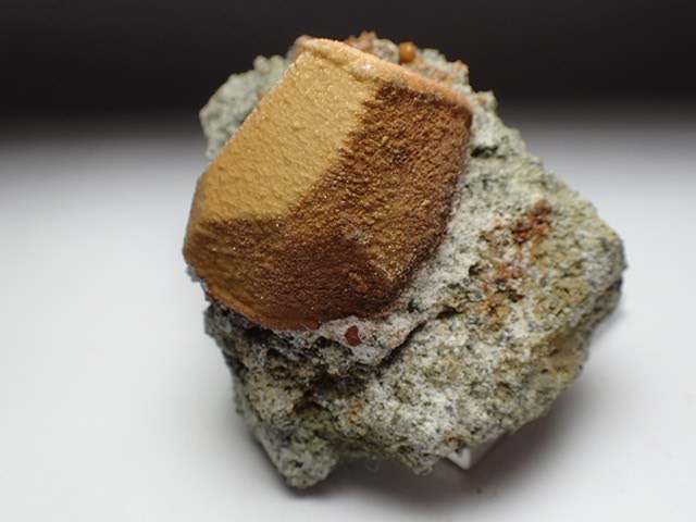 南アフリカ、Aggeneysで一度だけ発見された釘頭状のカルサイトが菱鉄鉱と閃亜鉛鉱の混合物に置き換わった見事な擬似結晶です。この置換の種類はエピモルフで、後からできた鉱物が元の結晶の上に形成され、鋳造された後、元の結晶は消失して溶解し、中空の殻はそのままになっています。 おもしろいコレクションです。結晶長さは約 3.5 cm で母岩にきれいに収まった美しい形状をしています。 |